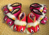 做虎头鞋,需要用刺绣、拨花、打籽等针法。做鞋者把七彩丝线巧妙搭配,使其色彩艳丽,美观大方,再用明光闪闪的1明珠做老虎的眼睛,看起来活波可爱,特受人们。欢迎。传统虎头鞋的虎嘴、眉毛、鼻子、眼睛全是手工刺绣而成,为了表现老虎的威猛,这些图案均用粗线条绣成,针法夸张,生动传神,绣出的老虎活灵活现。绣好底花后,再用绒线盘成小绒球缀在上面,这样装饰出来的老虎威猛而不失活泼。绣好后聪明的农妇还要在虎的额头绣上一个大大的“王”字。因为有“王”则为虎,无“王”则为猫。