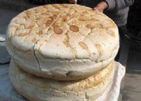 断总结,不断改进。把原来柴禾烧在小锅内烙制改成了用煤烘烤在鏊内烙制,把原来用手揉面改成了用木杠压面。这样以来上下烘烤,温高气保,火色均匀,熟的足到,达到耐存放的目的。用木杠压面,面排揉的到,能使馍色增白,香气浓郁,味美可口。具体作法是:面粉十斤,水四斤(水