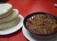 把猪肉漂洗干净,剔除排骨,将肉切成约6.6厘米长、0.6厘米厚的片,排骨剁成约1.6厘米长的块,一起放入盆中。大米用水浸泡4小时,碾成米糁。在辣子酱里掺入清水,和匀,用细竹筛过滤后,与精盐、五香粉、料酒、姜末、甜面酱、大米糁搅拌均匀,随后和肉片、排骨搅拌在一起备用。