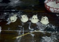 “看灯子"是一种民俗小吃,属于庆阳特产之一。一般是在每年的农历正月十五做,用来祭拜”灶神爷“的,源于汉明帝点灯祈福,用来驱魔降福、祈求光明,最后祝愿孩子健康幸福等。等祭拜之后小孩子就可以吃了。一般做成各种动物的样子,如鸟儿、羊头、牛头、鱼儿、麒麟等,都是些象征吉祥的动物。主要食材:面团、红豆、黄豆、黑豆等,用豆类做”眼镜“,所用工具:剪刀、勺子等辅助做出各种动物的样子。