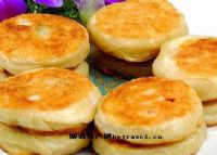 5.将平锅烧到七至八成熟时,把饼剂用手拍成直径约6.7厘米的圆饼下锅烙制,将锅刷少许油,看饼变色时翻过来烙,再刷点油,见饼坯两边都出现金黄色时为止。铲出,用湿布包起,上桌前把饼丝磕开,码入盘内。