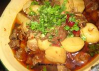 4、移入沙锅,加适量水,大火烧开,转小火加盖慢炖30分钟;这时将土豆切块,下油锅略炸盛出备用;