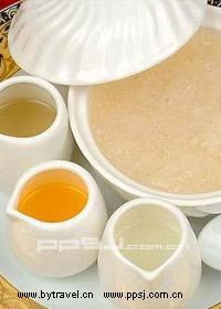 此菜以田鸡油为主料。将田鸡油用热水焯透,用冰糖炖煮,辅以樱炖、青梅丁等。成品色泽鲜艳、甜而清香,有化痰清火之功效。由于哈尔滨靠近大兴安岭林区,为我国雪蛤的主要出产地之一,虽然名贵,但的确是好东西,高级餐厅通常上百元一盅。